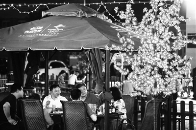 在位于百荣D座南广场的啤酒花园,百余张消夏凉亭鳞次栉比,慕名而来的食客,围坐在一起,谈论着各自感兴趣的话题。百荣世贸商城副总经理张蔚介绍,为搭上夜间经济的消夏列车,百荣从百余家餐饮商户中甄选十余家商户开办啤酒花园,提供特色海鲜、精美小食等。