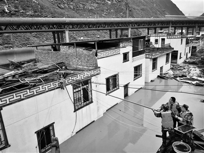 8月20日凌晨2时许,四川省阿坝州汶川县因强降雨致多个乡镇不同程度发生山洪泥石流灾害,多地道路、电力、通讯中断,造成人员伤亡。1名消防员在救援中牺牲。图为在汶川县克枯乡下庄村,救援人员为灾民送去救生衣。 新华社发