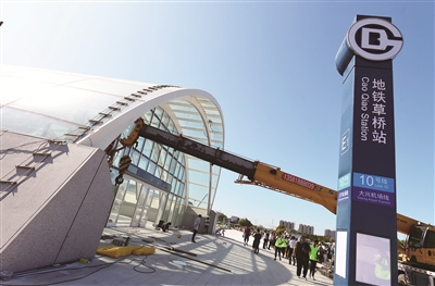 在草桥站,外部已经完工的草桥站E口形同一座“温室花房”,通透可见入口处正在进行调试的扶梯。开通后乘客可在草桥站与10号线进行换乘,未来可换乘19号线。