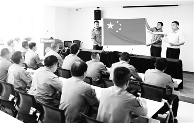 近日,海淀保安分公司驻建行中关村支行保安队组织保安员学习《中华人民共和国国旗法》,普及国旗知识,开展爱国主义教育,增强保安员的家国情怀。使他们更加坚定理想信念,勤奋地投入工作,以优异成绩迎接新中国成立70周年。
