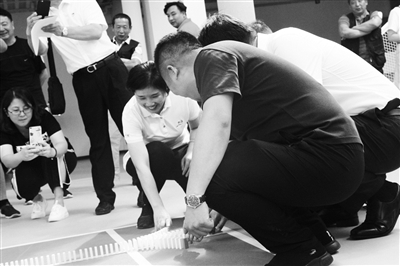 作为本届运动会的一大亮点项目,职工聚力多米诺迎新中国成立70周年项目将活动推向高潮。现场,瀛海市政的近百名职工及家属就齐聚位于党群服务中心的羽毛球馆。他们被带领教练分成了五组,开始了一个需要合力完成的“大工程”。接近一个半小时,集所有市政职工之力用多米诺骨牌拼成的向新中国成立70周年献礼的“礼物”准备工作完成了。