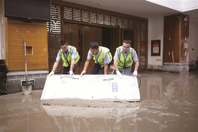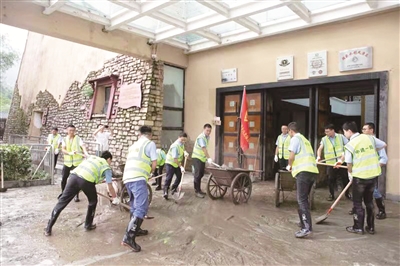 志愿者们经过急性的高强度劳动,不到一会儿手便打了水泡,手掌即便隔着手套也被铁锹磨得通红。但是没有一个人喊累,没有一个人退缩,都是一个劲儿的铲淤泥、推推车。而党支部书记兰正见,在脚受伤行动不便的情况下,依然坚守现场,依然用尽全部的热情和力量投入到抢险中。受他的鼓舞,一分队的志愿者们从早上9点一直到下午5点,终于将游客中心的大厅、休息厅里面的淤泥全部铲除。