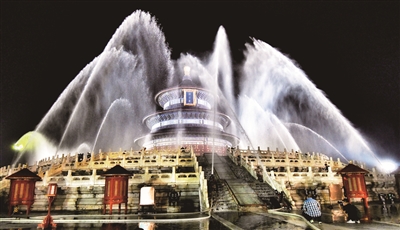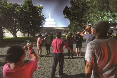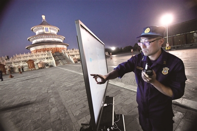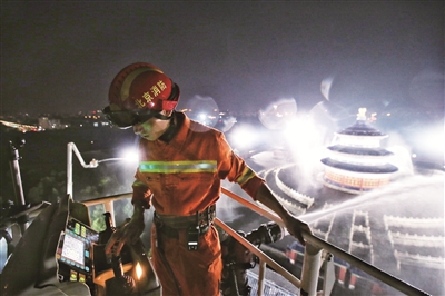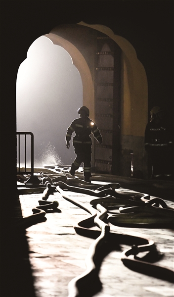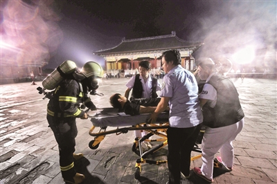 9月6日19时许,6支消防中队的16辆消防车集结天坛公园祈年殿外,90名消防队员紧急行动,5支水枪、4个移动水炮、2个灭火机器人、3台云梯高喷车一共吐出14条水柱,朝38米高的祈年殿屋顶起火点喷洒过去。这是东城消防支队联合天坛公园举办的一场文物古建应急救援综合演练。