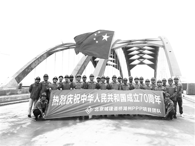 国庆节即将来临,近日,北京城建道桥建设集团职工在新落成的大桥上高唱国歌庆祝新中国成立70周年。道桥建设集团投身长三角经济区经济建设,承建了浙江湖州经济技术开发区基础设施项目。经过三年的建设,工程完成了80%的工程量,取得科技成果、质量成果10多项。其中,承建的弁南大道一期工程,跨越湖州第一大主航道长湖申河的钢结构大桥,将在9月底完工。