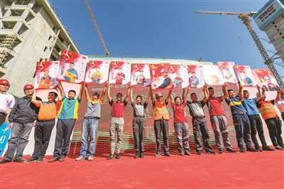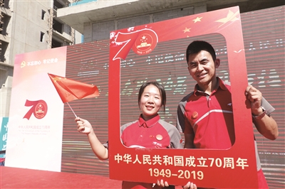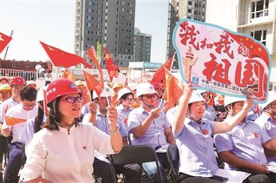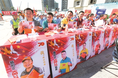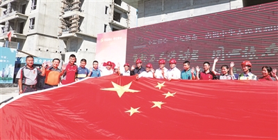 9月24日,由北京市总工会主办,劳动午报社、中建一局二公司承办的“把微笑带回家 为最美劳动者点赞”大型公益活动之“首都万名劳动者 同心接力绣国旗”呈献仪式在中建一局二公司北京城市副中心职工周转房项目工地举行。来自顺丰、京东、圆通、中通等8家快递公司的12名快递小哥和农民工代表获赠个人最美国庆海报。