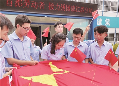 当天,在嘹亮的《我和我的祖国》歌声中,劳模、快递小哥和农民工代表共同完成绣国旗工作。标志着长7米宽4.7米的五星红旗历经48天后,由3万余名首都劳动者同心接力一针一线,用18万针绣制完成,为中华人民共和国成立70周年献上了一份特殊的生日礼物。