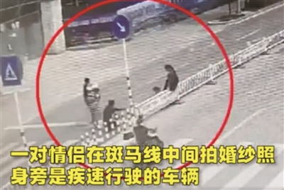 近日,云南昌宁县一对情侣在斑马线上拍婚纱照,全然不顾过往疾驶的车辆。工作人员为追求效果,还蹲下身子寻找拍摄角度。近日警方通报,交管部门已约谈该影楼,要求杜绝危险拍摄行为。