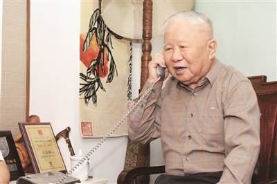 2012年教师节前,北京市领导到清华大学吴良镛家慰问,我跟随采访也来到了吴老家里。他家面积不大,摆设也很简单,客厅一面墙都是书籍。他在和领导交谈时,座位前的电话响起了数次。他总是礼貌地向领导表示歉意后接听电话。不管是谁的电话,他接电话时脸上总是带着笑容,很有礼貌地倾听对方讲话。我在他正接电话时,随手抓拍了他的音容笑貌。