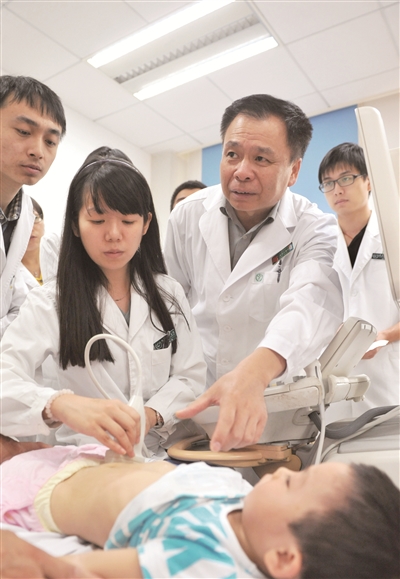 2013年9月我来到北京儿童医院B超科,护士远远地指着贾立群告诉我,人群中间的那位就是贾主任。我原地未动地看着,此刻贾大夫正在全神贯注地指导着年轻医生为患儿做B超,为了不影响他们的工作,也为了不打扰这真实生动的画面,我换上长镜头,稍作位置调整,拍下了这张图片。