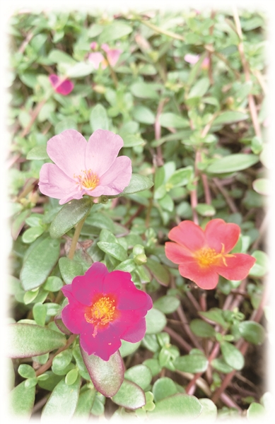 早晨在食堂门口偶尔看到了一片杂色小花,因为戴的眼镜不对,看不清,以为是死不了花呢。吃完饭出来,感觉叶子的绿色特别,摘了眼镜细看,原来是大花马齿苋,花朵叶盛,长势喜人。