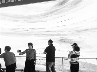 在展区中,市民借助空间镜像系统——全景三维地图,观看古丝绸之路的全景影像。展区中的《中国古代丝绸之路(陆路)数字三维全景地图》,展现了长度30万余公里,面积1300万余平方公里,涉及两汉、隋唐、元朝1500年间300张历史遗址图片,2000个文化地理标注,10000余个地图信息标点。市民们通过弧形主屏上展示的场景,观看天空、地面的镜像,彷佛跨越时空般走入历史的沉积,真切地领略丝路的壮美。