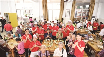 10月6日,90位志愿者来到广州番禺的蓝态长者饭堂,为160位老人义务理发、献上粤剧、合唱、太极表演等,送上“99爱心面”,与老人们一起欢度节日。