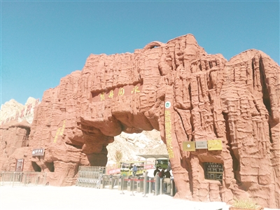 沿着蜿蜒的山路,不到20分钟便来到“冰沟丹霞”景区。这里位于张掖市肃南裕固族自治县。景区大门处于高山之下,为人工塑成的仿丹霞地貌结构,呈赤红色,高大气派,上悬“冰沟丹霞”四个金色大字,格外耀眼。门前一块硕大的宣传牌上,介绍着景区的概貌。