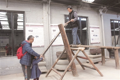 在展厅里,展示着各种锯等裁切木材的工具。在一根木头前,王文旺说:“咱们拉拉大锯吧。”王文旺边说边演示如何拉锯。在一个木质车轱辘前,“车轱辘一般都用木质比较坚硬的榆木来做。做成的独轮车轻巧、方便,而且耐磨、耐用,这是农民最喜爱的运输工具。”