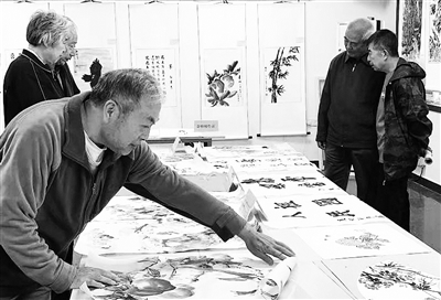 近日,在石景山区鲁谷街道永乐西南社区举办的“丹青书盛世·翰墨绘国色”书画展上,众多的小区居民拿起画笔,体验用笔墨描绘祖国秀美山河的书画互动活动。此次书画展分为国画、书法两部分,以“中国梦”“爱国情”为主题,展出的70余幅作品皆出自永乐西南社区翰墨书画苑的学员之手,旨在以书言志、以画传情,表达对祖国的无限热爱。