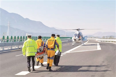 昨天上午10时15分,一架999救援直升机缓缓降落在京礼高速公路,将交通事故中的“伤者”通过直升机送往最近医院医治。这是北京公安交管部门联合999急救中心开展的“空地一体化”应急救援全流程演练。