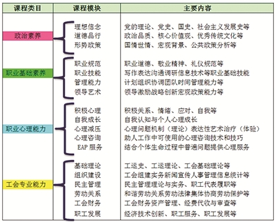 工会干部教育培训突出“建设党在工会工作领域教育教学特色鲜明的政治学校”定位,以培养“政治上靠得住、工作上有本事、作风上过得硬”的工会干部队伍为目标,努力构建实施具有首善标准、工会特色的工会院校教育培训模式。以课程体系建设为核心,搭建教学总纲。围绕新时期工会干部政治素质、职业素质和专业素质三方面能力要求,构建了包含18个课程模块、近300门课程的工会干部教育培训课程体系。以教学资源建设为重点,打牢发展基础。坚持“内引外联、分层分类、专兼结合”的原则,突出以“工会资源”为主,构建起“工会师资”(学院自有师资+工会系统兼职师资)和“社会师资”两大群体为主的师资队伍结构。持续推进教学基地和教学点建设,努力实现市总工会直属阵地资源和基层教育教学资源互联互通、共建共享。大力加强特色教材和教学资料的编写工作,及时体现新形势新任务对工会工作的新要求,增强培训内容的针对性和实效性。以教学总纲为导引,创新内容与形式。不断研发丰富现场教学、情景教学、体验教学、互动教学等灵活多样的形式,满足各级各类工会干部学习需求。