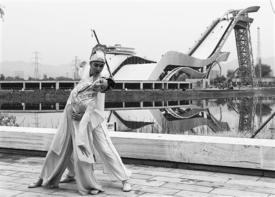 长亭下,碧水间,伊人起舞眼波涟。由来自国防大学军事文化学院的刘芳、杨海一、杨婷在群明湖上的一座凉亭下翩然起舞,共同演绎《伊人如画》。她们身着汉服,手击乐鼓,丝带在空中飞舞的曲线与身后有着“敦煌飞天”寓意的滑雪大跳台形象相得益彰,一时间,似是钟鼓齐鸣,梦回大汉。