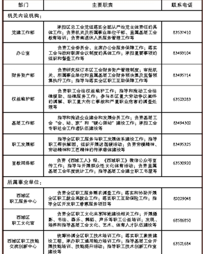 西城区总工会积极回应职工群众关切,将机关各部室、所属事业单位这些职责、电话一一晒出来,拨个号码,您只要详细说明您想要咨询、反映的问题,工作人员会及时地予以落实和回复。