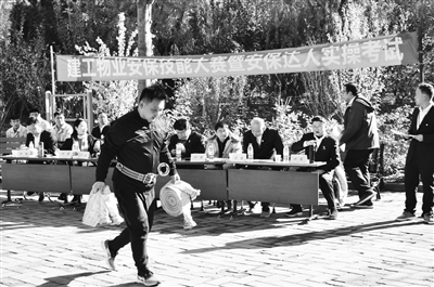 11日,北京建工物业服务有限公司在朝阳区安慧北里阳光新干线小区广场举行了“安保达人”实操比赛。比赛分个人赛和团体赛两个组别,包含消防水带连接、消防器材设施检查、火灾隐患图片识别、呼吸器的使用及初期火灾处理等多个考试项。本报记者 彭程 摄影报道