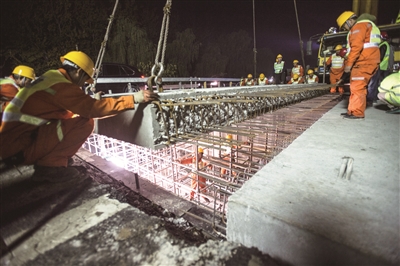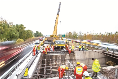 北京首发养护公司第三养护中心副经理高伟介绍,本次施工的难点在于该通道桥临近窦店收费站入口,在高速公路大流量重载交通的条件下,实现双向不断交通、快速完成换梁施工。