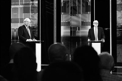 11月19日,在英国索尔福德,英国首相、保守党领袖鲍里斯·约翰逊(左)与英国工党领袖科尔宾参加英国独立电视台举办的首场电视辩论。英国大选将于12月12日举行。 新华社发
