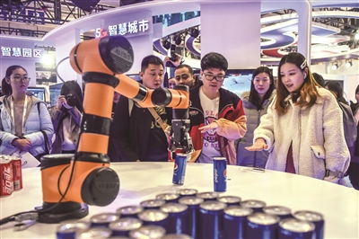 11月21日,主题为“5G改变世界,5G创造未来”的2019世界5G大会在北京开幕。图为参观者体验“隔空取物”,控制机械臂抓取饮料。