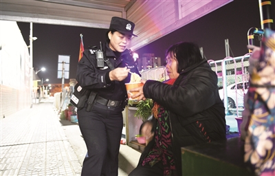 “今晚太冷了,手里都想捧个小火炉。”虽然寒风凛冽,但王聪颖依旧警服严整,始终面带微笑执行巡逻任务。客运站站前广场、周边以及候车室、站台,都是她的巡逻范围。