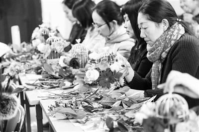 “下一个花艺使用复古感觉的花器糅合玫瑰的色调,营造出自然的跃动感。”社区花艺老师正在指导大家完成鸟笼花艺,“第一步,大家把装有花泥的杯子放在小盘里,一起放在花器上”。近日,来自北京建工博海公司与长安新区社区青年汇的31名青年齐聚花艺学堂,开展鸟笼花艺体验课。
