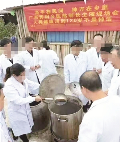 据网传图片显示,约十人围站在铁桶旁边,现场挂有横幅,上面写道“高手在民间,神方在乡里。广西宾阳乡医熬制长生液现场会,人类健康活到120岁不是梦。”据称,所谓的“长生液”是由中草药熬制而成。调查表明,该活动没有经过行政部门批准,参加此次活动的乡医们分别作出了书面检讨。