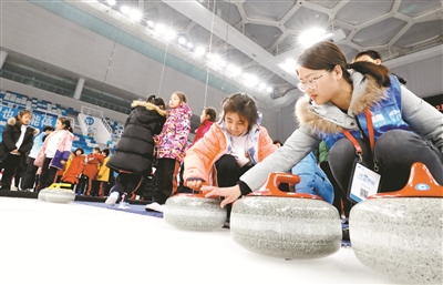 经过一年的冬奥冰壶场地改造,国家游泳中心成功实现冰水转换。昨天上午,全新亮相的“冰立方”首次对市民开放,小朋友们前来体验冰壶运动,感受冬奥运动带来的乐趣。