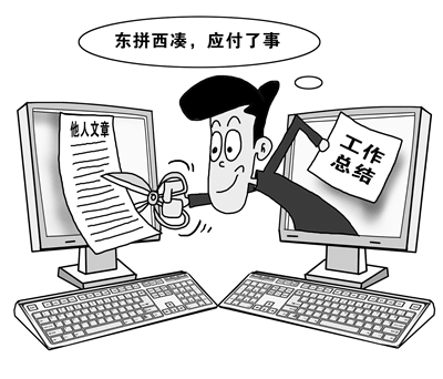岁末年初,是各单位、各部门总结工作的时候,也是许多公职人员汇总材料的集中时段。“地点改一改,主角换一换”“同样的工作内容,雷同的报告和方案”……《瞭望》新闻周刊记者调研发现,个别基层单位或少数公职人员在起草文件、撰写材料时,仍然存在照搬照抄、抄袭拼凑现象,有的甚至催生出范文售卖、代写服务的产业链。(12月9日 新华网)□朱慧卿