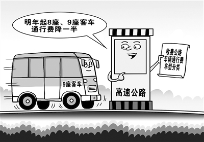 记者14日从交通运输部获悉,明年起,所有跑高速的车辆都将按照修订后的交通运输行业标准核定收费,其中8座、9座客车收费标准将降一半。(12月14日新华社)□朱慧卿