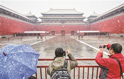 故宫作为赏雪圣地,自然一大早就被大伙儿盯上了。尽管星期一故宫未曾对游客开放,但午门前和神武门后边 ,前来赏雪打卡的人依然络绎不绝。人们纷纷拿出手机,与银装素裹的故宫合影。