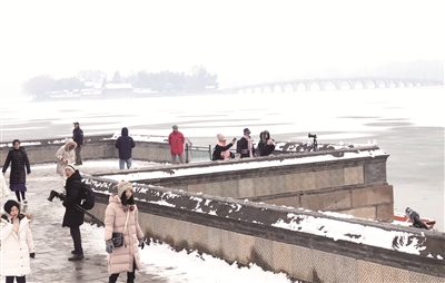 天坛和颐和园,作为京城老牌的赏雪景点,来的游客比往常更早。虽然早上的交通受到降雪影响,但游客们赏雪雅兴不减反增。雪中的祈年殿多了几分风姿,而昆明湖和佛香阁则在雪中平添了几分窈窕。