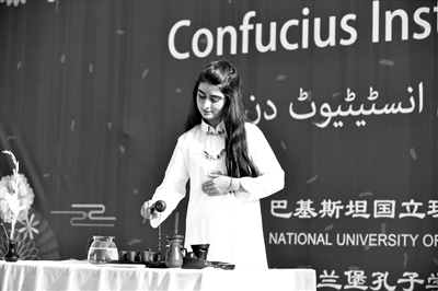 12月17日,巴基斯坦国立现代语言大学伊斯兰堡孔子学院举办“开放日”活动。图为一名巴基斯坦学生在伊斯兰堡孔子学院举办的“开放日”活动上表演茶艺。新华社发