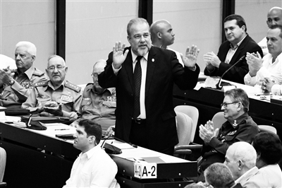 马雷罗今年11月以旅游部长的身份访问中国,向中国市场推介古巴旅游资源,欢迎中国公民赴古旅游。图为古巴新任总理曼努埃尔·马雷罗(中)向与会人士挥手致意。