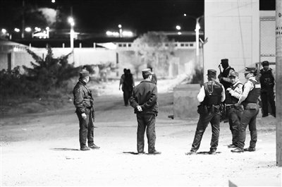 洪都拉斯监狱系统监管混乱,暴力事件频发。本月初,在洪首都附近一个少管所内发生的械斗造成4名未成年囚犯死亡。洪都拉斯政府本月17日宣布监狱系统进入紧急状态,由国家跨部门安全部队接管。图为12月22日,在洪都拉斯埃尔布罗维尼尔市,警察在发生暴乱的监狱外警戒。
