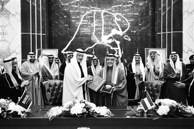 沙特与科威特均为石油输出国组织成员。地处两国边境的沃夫拉和海夫吉两处油田所在地区历史上属于两国中立区,油田资源由两国共享。2014年,沙特以保护环境为由叫停了海夫吉油田的石油生产。2015年,科威特暂停了沃夫拉油田的石油生产。图为12月24日在科威特首都科威特城拍摄的协议签署仪式现场。