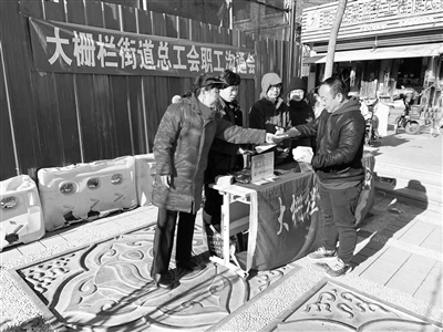 本报讯 (记者 陈曦)近日,西城区大栅栏街道总工会在人流密集地开展了职工沟通会,向前来咨询的企业、职工开展全方位服务,进行工会政策宣传,建会、入会必要性宣讲。