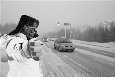 12月29日,漠河市公安局交通警察大队执勤交警张琪在极寒天气中指挥交通。隆冬时节,早晨7点半到8点半,“中国北极”黑龙江省漠河市最低气温可达零下40多摄氏度,极易出现能见度仅百米左右的“冰雾”天气。为保障市民出行安全,每天早高峰时段,漠河市交警都要冒着极寒天气在户外执勤。 新华社发