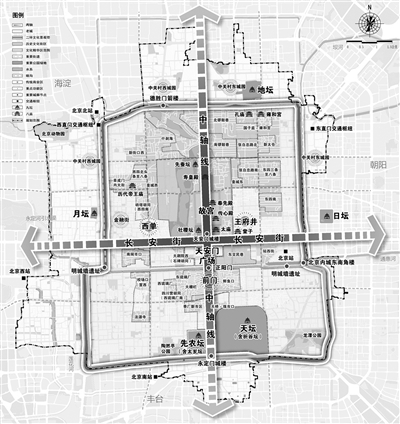 规划将老城空间格局的核心构成,即两轴、四重城廓、棋盘路网、六海八水、九坛八庙作为整体进行保护。九坛包括天坛(内含祈谷坛)、地坛、日坛(又称朝日坛)、月坛(又称夕月坛)、先农坛(内含太岁坛)、社稷坛、先蚕坛(位于北海公园内)。八庙包括太庙、奉先殿(位于故宫博物馆内)、传心殿(位于故宫博物馆内)、寿皇殿、雍和宫、堂子(已无存)、历代帝王庙、孔庙(又称文庙)。四重城廓包括明清形成的紫禁城、皇城、内城、外城城廓。四横两纵包括朝阜路、平安大街、前三门大街、两广路、东单大街-崇文门大街、西单大街-菜市口大街。六海包括北海、中海、南海、西海、后海、前海。八水包括通惠河(含玉河)、北护城河、南护城河、筒子河、金水河、前三门护城河、长河、莲花河。