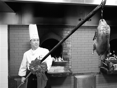 昨天,全聚德王府井店举办新年送祝福活动。当天,全聚德王府井店出炉“福”字烤鸭,并为第一拨用餐宾客赠送特色风味菜“菠萝咕噜鸭”和“福”牌挂件,寓意在新的一年为宾客送祝福、送福气、送福运、送“福”鸭儿。本报记者 邱勇 摄影报道