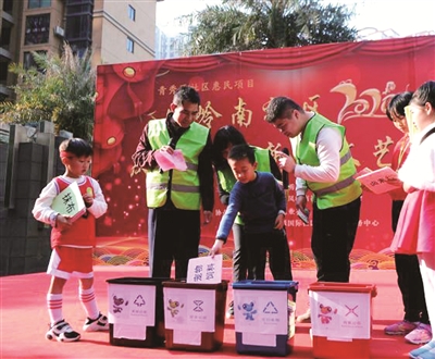 近日,广西南宁凤岭南社区携手广源国际社区共同举办“庆元旦·迎新春”文艺联欢会,为全体业主献上一台文化大餐。垃圾分类督导员利用庆元旦文艺演出的机会,走进小区,宣传垃圾分类。当天的宣传,以现场互动和诗歌朗诵等方式进行。为推进垃圾分类工作,南宁市采取了举办社区广场舞汇演活动及分发宣传资源等方式,灵活宣传垃圾分类。