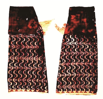 在新疆地区也曾出土东汉至晋代的织锦手套,如民丰尼雅1号墓地3号墓出土一副手套上还织有“世毋极锦宜二亲传子孙”字样,长35.5厘米。它的形状与马王堆汉墓所见相似,四指合并,大拇指歧出,露出指头。