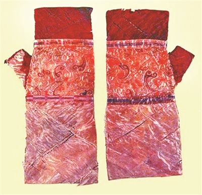 古代还有丝绢菱罗缝制的手套,长沙马王堆汉墓就有出土。墓中随葬的一件九子漆奁里,就装着三副手套。其中一副“朱色菱纹罗手套”,长26.5厘米,直筒露指头形,大拇指套分缝,掌面为朱红色菱纹罗,掌部上下两侧饰“千金绦”,绦上有篆书白文“千金”字样。