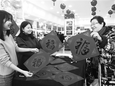 红红火火的福字寓意平安吉祥,也增添了浓浓的文化年味。昨天,北京稻香村14家门店开展“写福纳福”活动。在卖场里摆放着笔墨纸砚,顾客可以现场挥毫泼墨,书写福字,临近春节,北京稻香村店内的京味儿推广大使会为排队的顾客发“过年糖”,让店内来购物的顾客也能感受到新春里的甜蜜祝福。