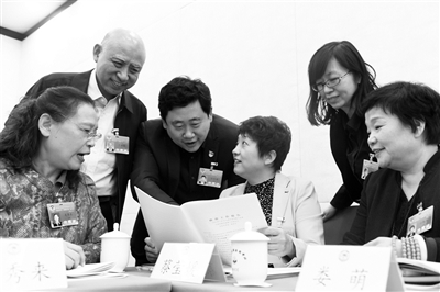 1月12日下午,北京市政协十三届三次会议召开首场界别小组讨论会。会议休息时间,工会界委员们就上午新鲜出炉的政府工作报告进行讨论,对这份报告给予了充分的肯定,并针对具体内容建言献策。本报记者 孙妍 摄影报道