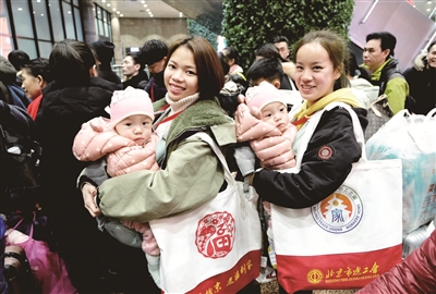 “终于能回家过年了!”1月18日下午的北京西站,在广西壮族自治区政府驻京办联合自治区总工会和北京市总工会共同举行的2020年广西在京务工创业人员春节“贴心服务 温暖回家”返乡欢送活动中,200多名即将踏上爱心列车的务工创业人员脸上洋溢着幸福开心的笑容,“可以免费乘坐卧铺火车回家,还有免费的餐券,好开心!”19日,余下的100多名务工创业人员也踏上了爱心列车返回广西。