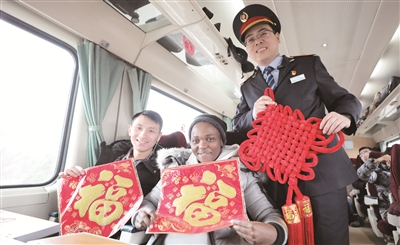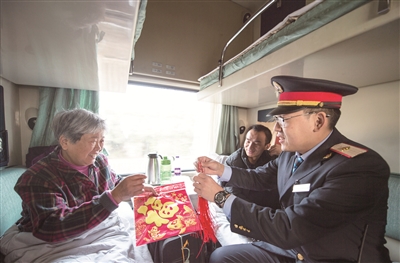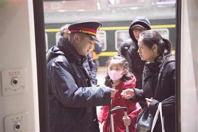 发放铁路安全册,为患病旅客提供药品,送旅客福字春联,陪旅客聊聊家常。从引导旅客上车后开始,北京西电务段职工们便进入了忙前忙后的春运状态。不管是耄耋之年的老人,刚上小学的孩子,还是首次体验春运的外国友人,总能看到他们在车上奔波的身影和有事随叫随到的那份热情。“下车的旅客请拿好自己的行李,注意列车和站台之间的间隙……”22岁的杜润身,是本次值乘队伍中最年轻的一员。他坦言,自己2018年入路,今年第一次值乘,刚开始看着拎着大包小包的人群、车厢里哭闹的小朋友,兴奋的同时有点儿手忙脚乱。“不过这么一趟车跑下来,还真是锻炼人,学到了不少东西。”蜂拥而来的旅客在他的引导下井然有序,收脚踏板关门锁车一气呵成,车厢卫生干净整洁,解答旅客问题细致耐心,对旅客视同家人。杜润身的第一次春运值乘,感动了他人,也感动了自己。
